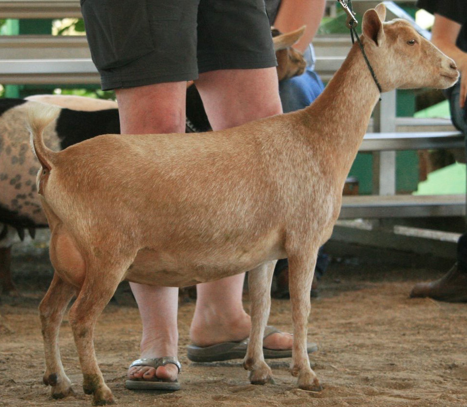 This golden girl came into the world just a week after one of my very favorite does of all time, Lunar Eclipse, went to sleep for the last time, and the name seemed like a good tribute to a doe who made me smile every day. This girl won't go in the holding stall at milking time until I pat her on the head and tell her she's a very pretty girl, which, as quirks in goats go, was a fun little routine, until a bunch of the other does caught on, and now also insist on hearing compliments before walking into the stall as well. She has strong scores in dairyness, a high rear udder, and a nice rounded escutcheon, allowing her to easily move around her udder. She's long bodied with good width and depth for her age, pictured here as a first freshener.