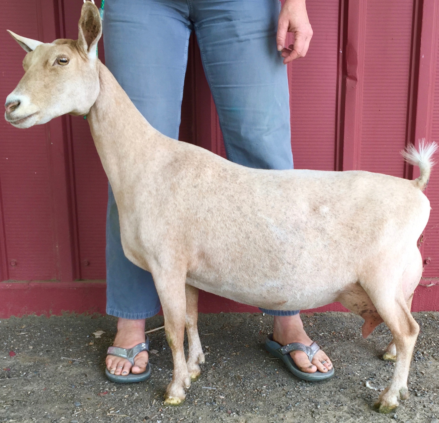 Tahiti has the incredible general appearance we have come to expect from Cleveland Sage daughters, along with tons of dairy character, a wonderful escutcheon arch, very good capacity, and texture. We'd like to see her a bit tighter in the toes, and if we were being really picky, a bit sharper in the withers. In 2019, she kidded less than two weeks before our LA session, so was still putting herself back together, though by the time the National Show came around, she definitely was in full bloom, easily rising to the top of her class, and going on to win National Champion and National Best Udder. She has a very sweet disposition, and is so veeeery chill. Nothing surprises her. Well, except for that time that something (probably a racoon) bloodied her up overnight. She was a little shocky for a few days after that, but we were very relieved to see her get back to her old self relatively quickly, and that her production came back by a week or so later.