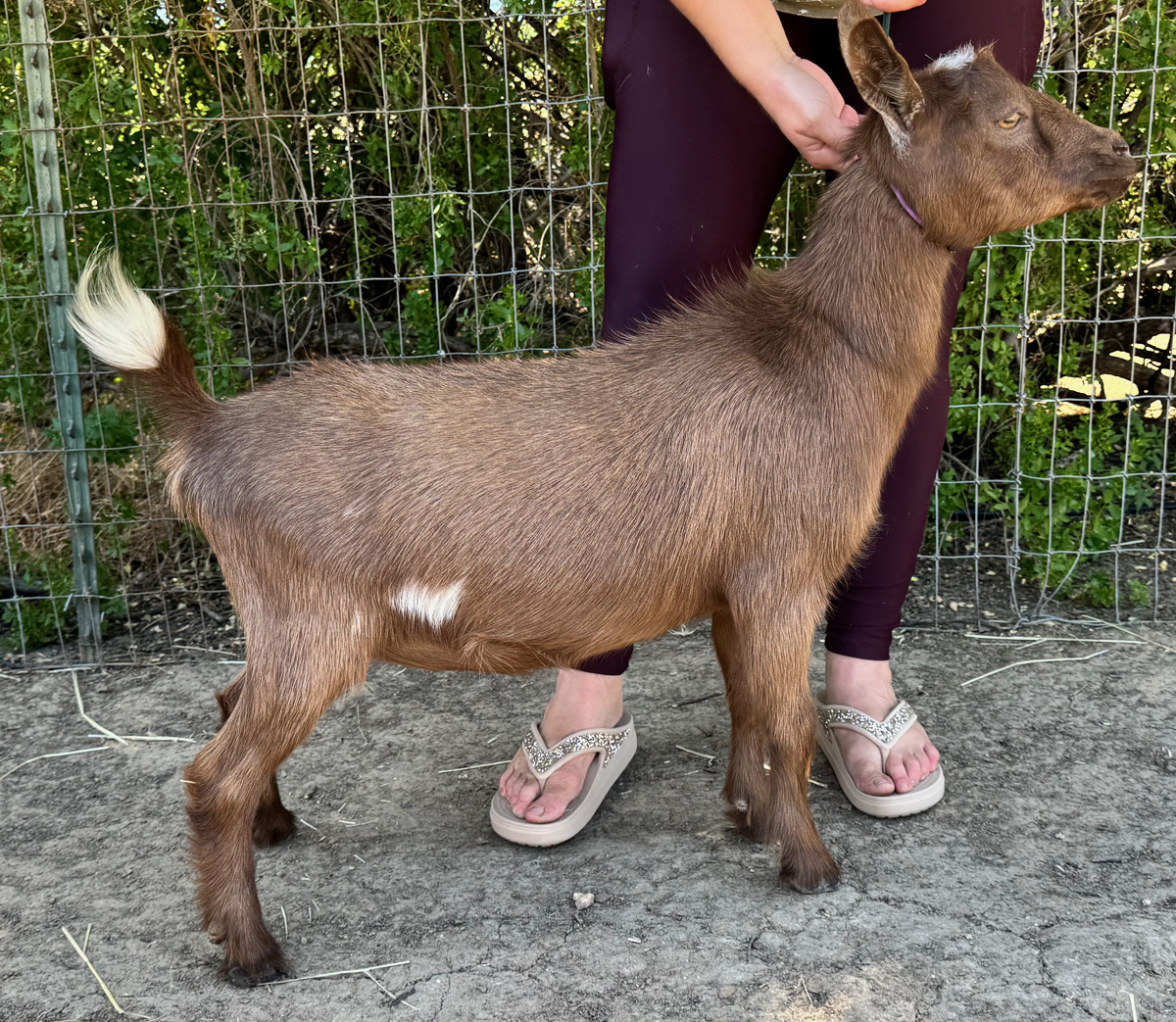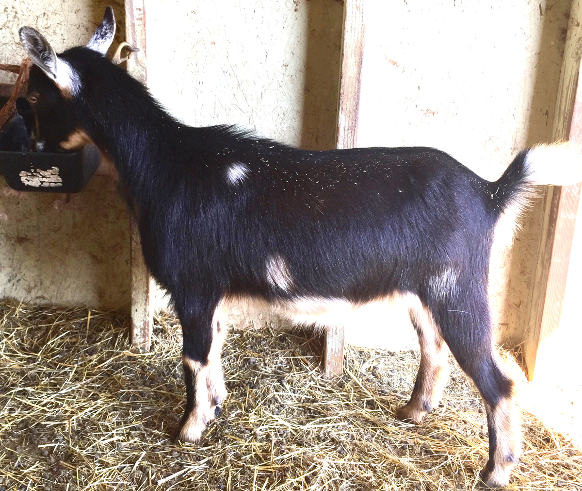 One of our suprise kids from 2019, this moon spotted doe is maturing nicely, showing some of the strengths we were hoping to see come through from Snow Patrol- a clean high escutcheon, strong back, and wide rump.
