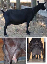 in our herd. She easily earned her MCH as a young doe, and when ADGA opened up a Nigerian herd book, she went out and won her GCH as a six year old. She has beaten the big girls for Best Doe in Show three times, and between AGS and ADGA has seven best udder awards. Not only does she show well, she produces in the milk bucket, earning the top spot for one day milk test in 2003 with 6lbs. of 5.07% butterfat milk. At seven years old, she earned EEEE FS92 on ADGA's Linear Appraisal.
