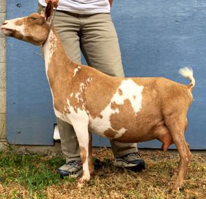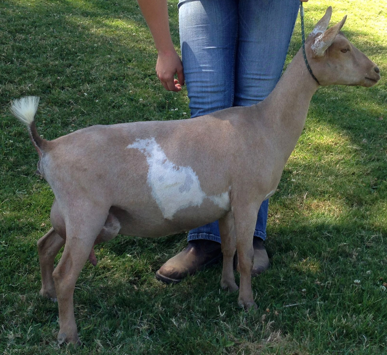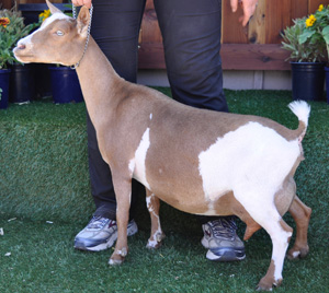 There are so many things I appreciate about this doe- she has wonderful dairy character, a wide rump from thurl to thurl, a really good front end, and a well attached udder that is high and wide when viewed from behind. While she is named Sun Maid, after a rose, her color makes me think more of the brand of raisins, which led me to calling her Raisin, which somehow morphed into Rey. Though she has done quite a bit of walking on her back legs and hopping around the show ring, if she manages to stay on all four feet, she shows off how lovely she is and winds up near or at the head of her class. Her second freshening udder is lovely, and she seems to have stretched out even more this year. According to Linear Appraisal, she has an excellent head, back, rump, and udder texture, and I can't argue with any of that. I'm very pleased with how she is maturing and her quiet, sweet personality. We lost Sunmaid far too early, but have her son, Castle Rock Rainbow Sunblaze, to hopefully continue her legacy in the herd. | |||||||||||||||||||||||||||||||||||