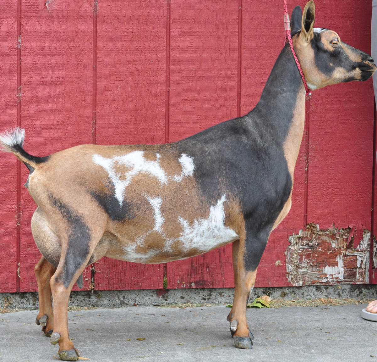 Sire: Castle Rock Tanzanite +*B *S Flash never made it into the show ring as a junior because every time I went to pull her out of the pasture to get her ready for a show, she was in yet another funky/awkward growth stage, and ended up staying home. She is our ugly duckling of a kid who has turned into quite the swan! Her first show weekend was all it took to win her permanent championship. We had a Nigerian Specialty show just a week after she completed her permanent championship, and she was once more GCH, and part of our first place Dam and Daughter entry, and our first place Best Three Does entry, and she repeated all of those wins again in August at the Sonoma County Fair. In 2015, she started the year out rough, with a challenging delivery on a Friday the 13th, which lived up to its bad reputation, and suffering a few complications from that. After lots of care, she finally bounced back, and bounced back in a big way! After winning National Champion and National Best Udder, she went on to be part of our first place Best Three Females, and Best Dairy Herd entries. I love her general appearance, with that long lean neck, blending into her withers, and a great topline. Her front legs are set right under her shoulders, she has increasing depth and width of barrel, and her back legs are angular with good width between the hocks. Her udder is capacious and well attached, with soft texture, and large easy to milk teats. She is so feminine and elegant, but clearly also a powerful doe without being course. Flash was killed by a coyote in February 2018 just a few days before she was due to kid for the first time since 2015. Of all the goats on our farm the coyote could have picked, it could have been literally anyone else and it would not have been as devastating. There are so many things to say, but that would be an essay that would take up way more than anyone wants to read here. There's a huge hole in our herd as we were counting on her genetics to help carry the herd forward, and to lose that opportunity so unexpectedly has me reeling a bit. DHIA: