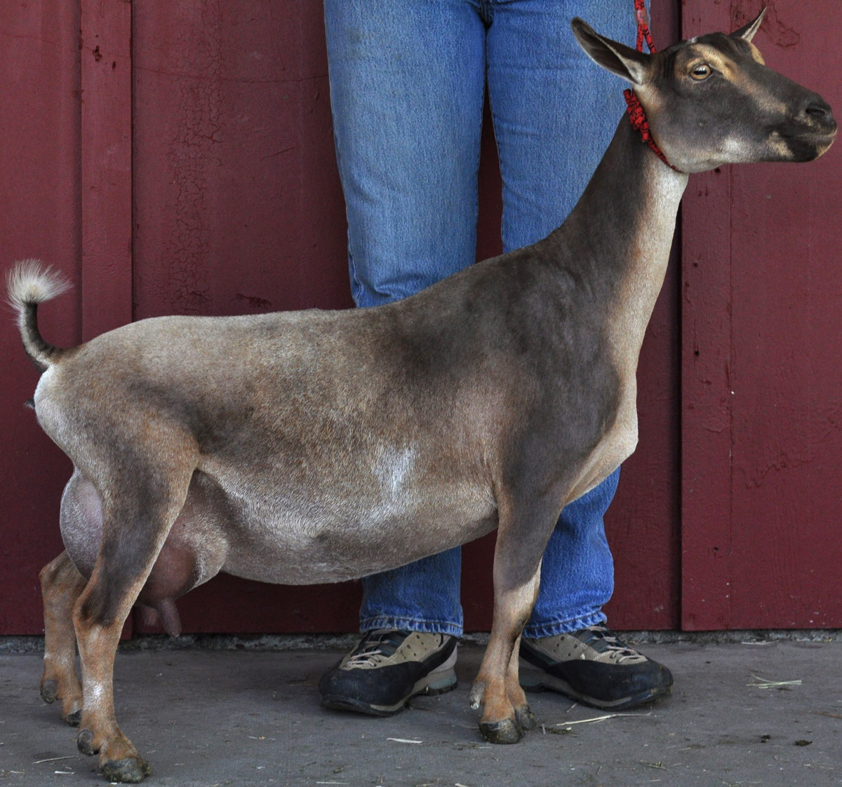 Sire: CRF Castle Rock Guy Noir ++B +S Roxanne is a very long necked, angular, and wide doe with good blending and a smoothly blended front end assembly with a flat topline. Even though still small, she has a tremendous amount of width between her hocks on the move- a trait that runs pretty strongly on the maternal side of her family tree. While she is a long bodied doe, I would like to see a little more width of body when viewed from above. She has soft udder texture, good teat placement and size, a strong foreudder, and is very easy to hand milk. As a five year old, she started to really hitting her stride, winning quite a few champion challenges, and Best Udder awards with an udder that is high, wide, capacious, and well attatched, with a strong MSL, and well placed teats. She continued to do well as a six year old, racking up her 20th Best of Breed award and winning a Best Udder in Show against the big girls. As a seven year old, she made it clear that she was so over this showing thing, and we figured with 21 Best of Breed wins, she has earned the right to relax at home. Update: in 2019, Roxanne freshened for the 10th time and looked so good, I just had to see if she would be okay with showing again, and at two weeks fresh, she picked up two more BOB and best udder wins! Gotta love a doe who holds up that well over time!