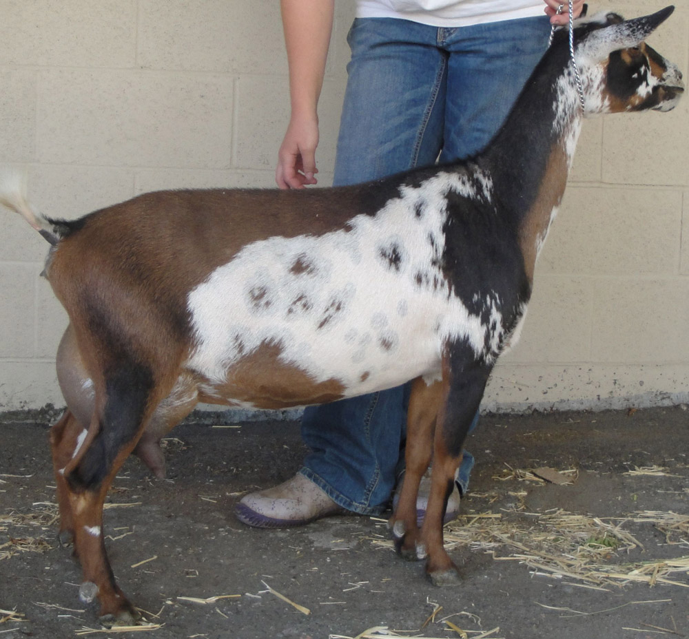 Lula is a very stretchy, elegant, dairy doe who stands on a strong set of feet and legs. She walks with lots of width between her hocks, has good spring of rib and her soft pliable skin makes it very easy to feel how widely spaced they are. Her udder is wide and capacious with a strong MSL, though her foreudder could be a bit more smoothly blended. I really like her general appearance and dairy character, and she has finished her championship against some very large, competitive classes of does. DHIA: