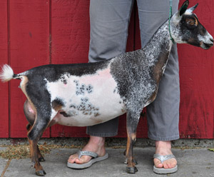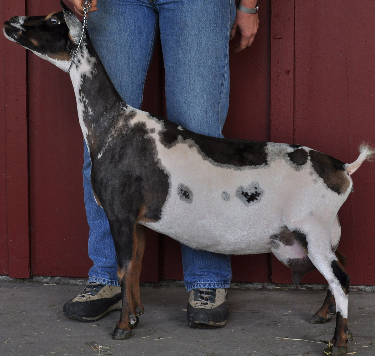 Sire: Twin Creeks BW Rebel w/o a Cause *S Sky has a high escutcheon, a nice front end assembly, is very full in the crops, has length from hips to pins, and good depth of barel. Even though she was dam-raised, she could easily be mistaken for a bottle baby, as she still tries to jump up in my lap- which at her current size is a bit uncomfortable. We are very pleased with her udder- so far, she has accumulated eleven best udder awards over some very tough competition! She has lots of attachment all around, a high rear udder and a smooth foreudder with a strong MSL and nice large plumb teats, and milks down to almost nothing. She has perfect milk stand manners and if, by some strange happenstance, another doe gets to be milked first, Sky will loudly let you know that this is NOT okay, and should not happen again in the near future (if ever). Sky is now retired and keeping watch over the herd as our current queen and settler of disputes amongst does. She has passed on wonderful attributes to daughters SkyRocketGilia, GCH Siren Song, and GCH Ghost Pine.