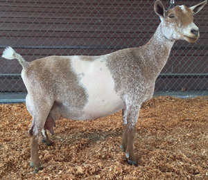 This doe is the product of a repeat breeding that produced our herdsire, Bentley. She has loads of dairyness, straight front legs, and excellent udder texture. Her MSL is strong, and she has easy to milk teats, a strong foreudder, and a lovely rear udder arch. Karmann has a nice level topline, smoothness of blending and angularity with a very feminine face.
