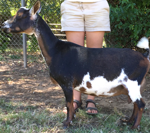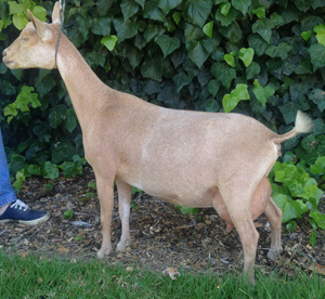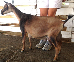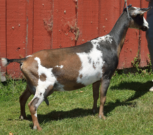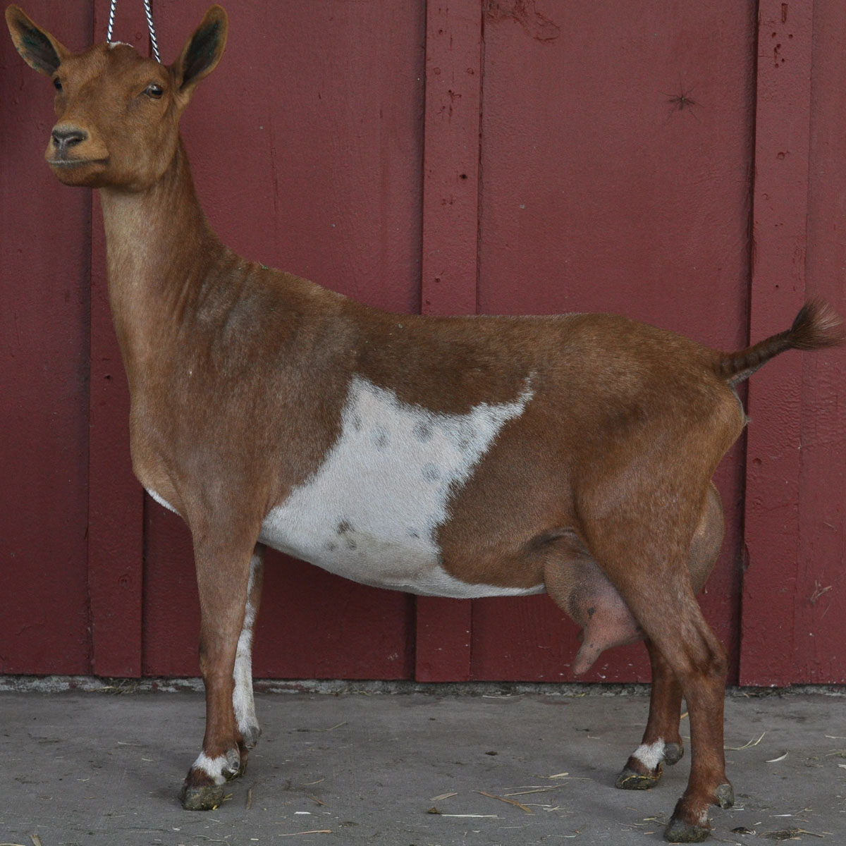 Nice, smoothly blended doe with good brisket extension, a very good front end assembly, depth of body, and a wide rump with well placed thurls. She has a well attached mammary system, with excellent texture and plumb, easy to milk teats. Mahindra is very likely to be right behind or next to me any time I am in the same pasture she is, and is our self-assigned barnyard-project manager. Mahindra is almost always first or second in her class, and has gotten lots of compliments for her general appearance and udder shape and attachments. | |||||||||||||||||||||||||||||||||||