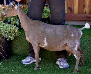 Sire: Twin Creeks BW Montego Bay +*S ++*B Sarafina embodies so much of what I am aiming for in my herd. In 2011, she and Annika tied for the highest "dairyness" score in our herd, and Sarafina topped that off with an E for udder texture. She's sharp and elegant with flat bone, wide spacing between the ribs, thin dairy skin, angularity, and one of the best (widest, flatest) rumps in our herd (she got an E on rump during Linear Appraisal). Sarafina has a very good rear udder arch, easily walks around her capacious udder on very sound rear legs. She is a quiet, dignified doe with good milk stand manners.