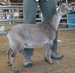 Sire: Castle Rock Chicago Peace ++*B Washoe combines really nice general appearance with good dairy character, flat bone, spring of rib, and overall correctness. I was very pleased with how she did on LA, espcially considering she was only two weeks fresh and had been missed when it came to getting the routine selenium supplementation all of our goats must have to look half way decent around here. She has a really nice escucheon arch, with a wide, well attached, easy to milk udder, with plumb teats. She also has excellent front legs, high pasturns, good width and depth of body, with an excellent back.